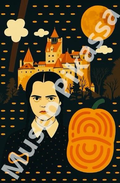Wednesday Addams Family – Disney-Inspired Castle & Pikassa Pumpkin combines the dark charm of Wednesday Addams with the festive joy of a Disney-style castle and Pikassa’s playful pumpkin design.